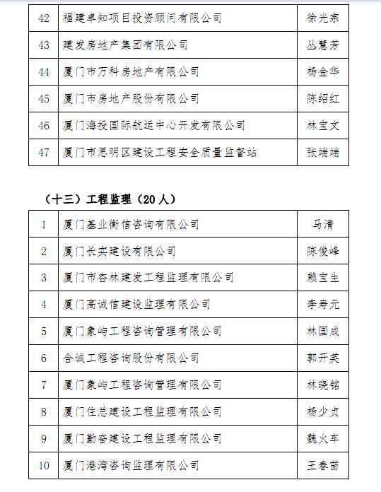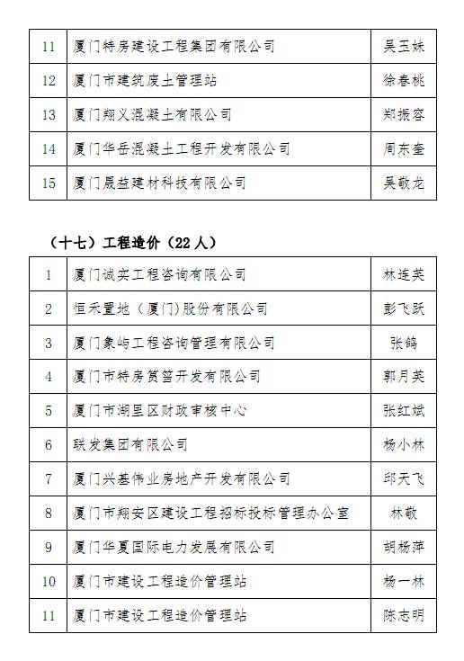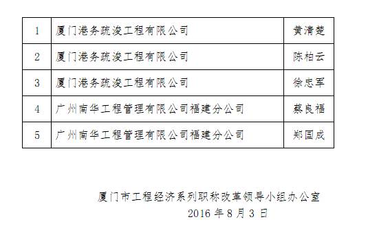 市工程经济职称改革领导小组办:2017年度厦门市工程系列中级专业技术职务任职资格评审(综合类)通过人员名单公示
